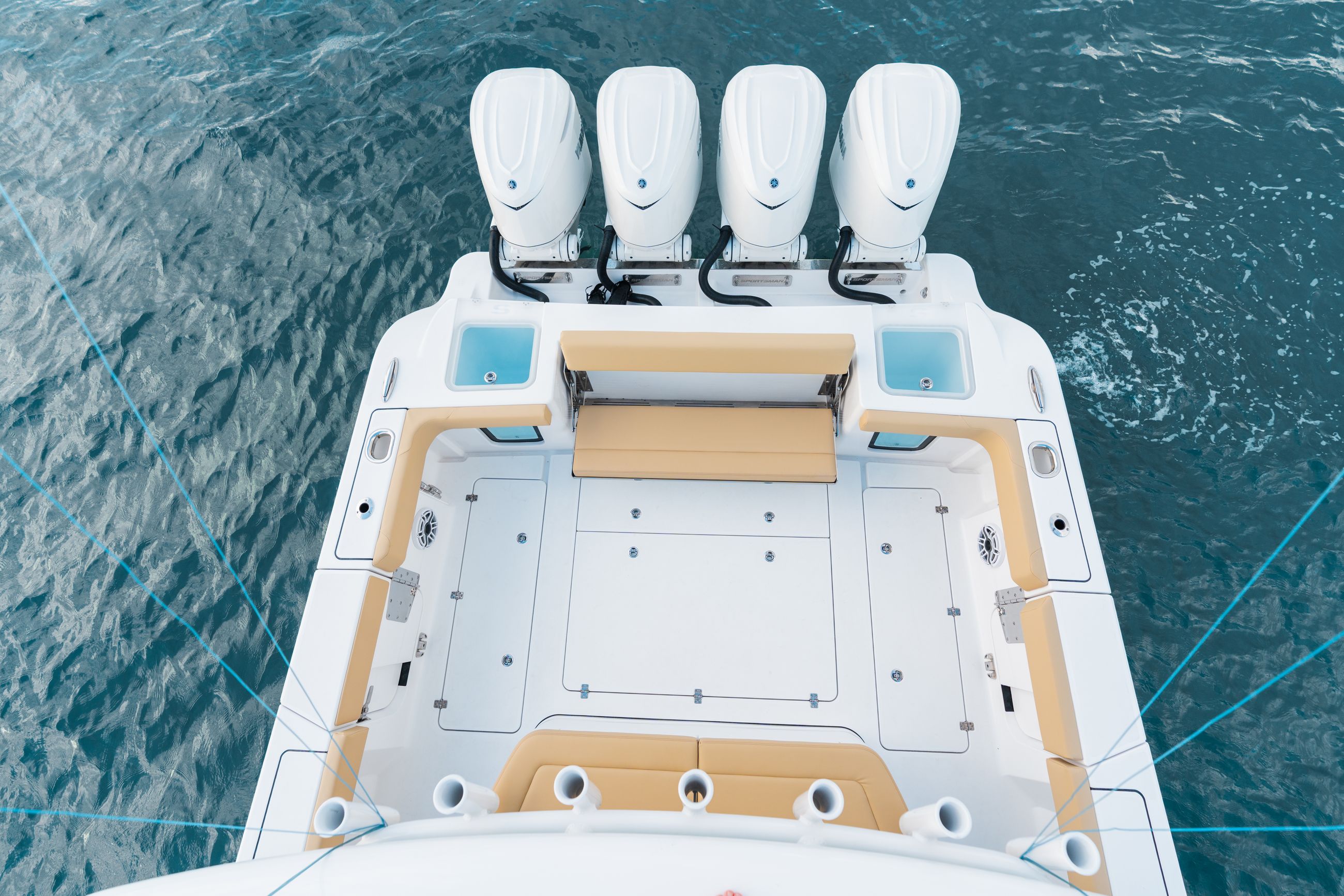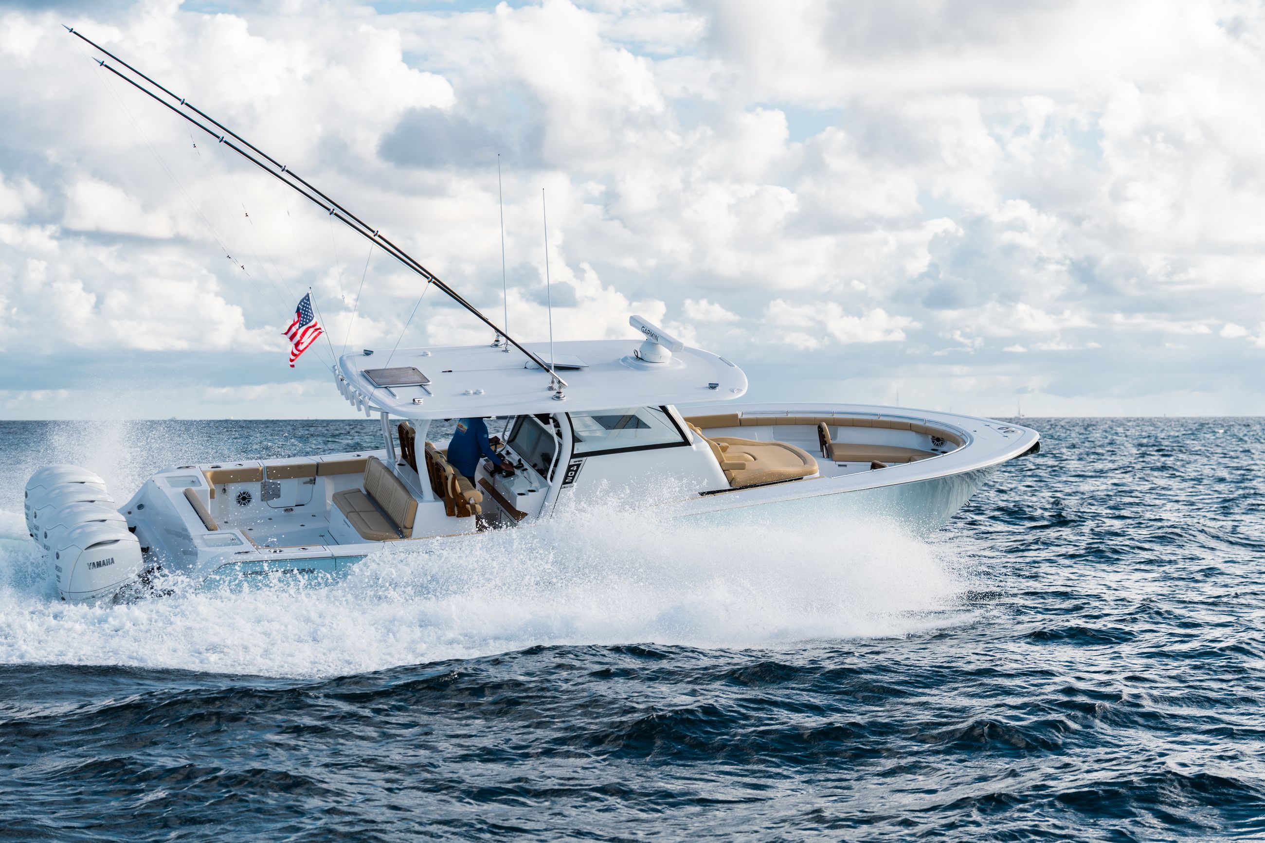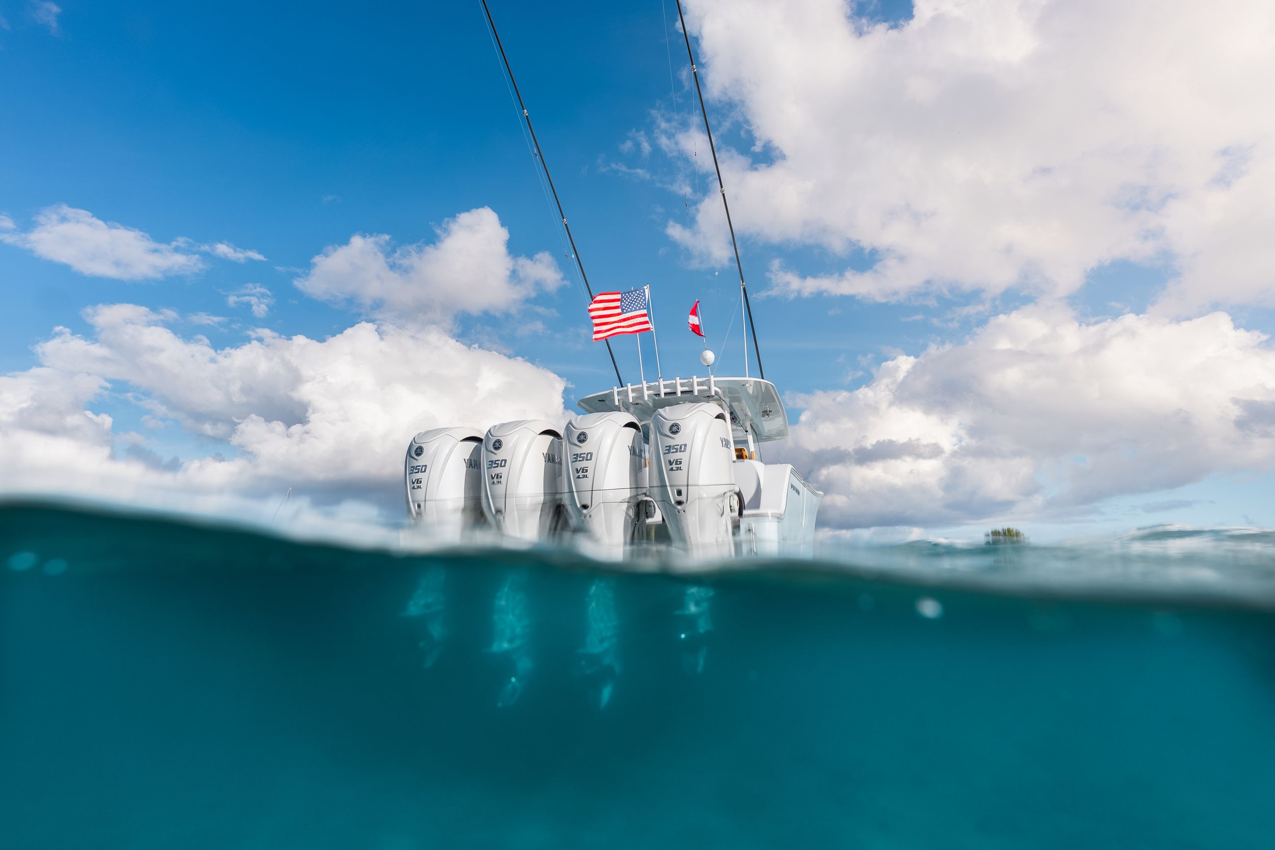 Available Yamaha options include quad 350s or triple 450s, delivering strong torque and long range capability. Mercury power options include quad 400 V10s or quad 425 V10s, offering impressive performance and offshore reliability.