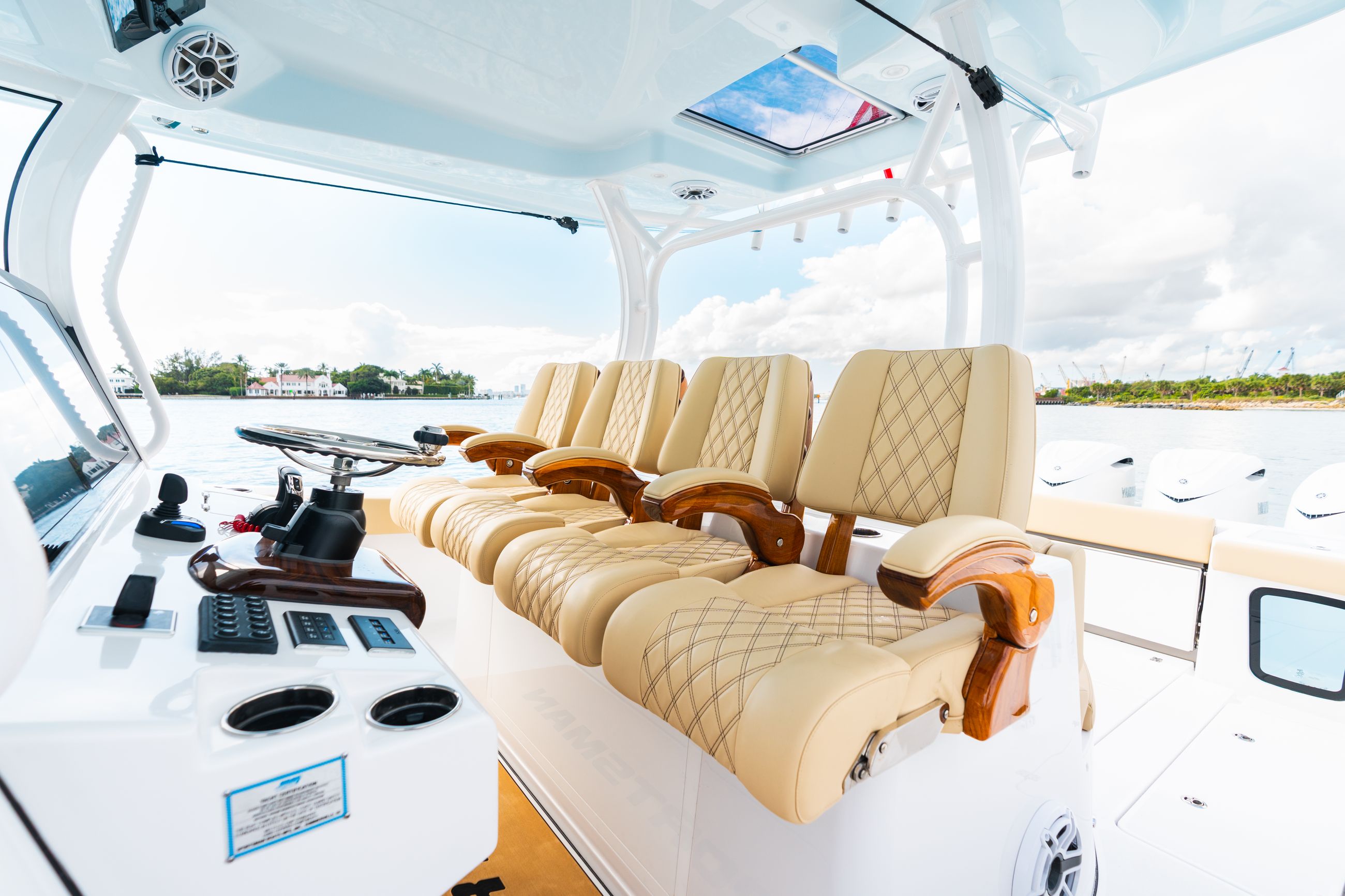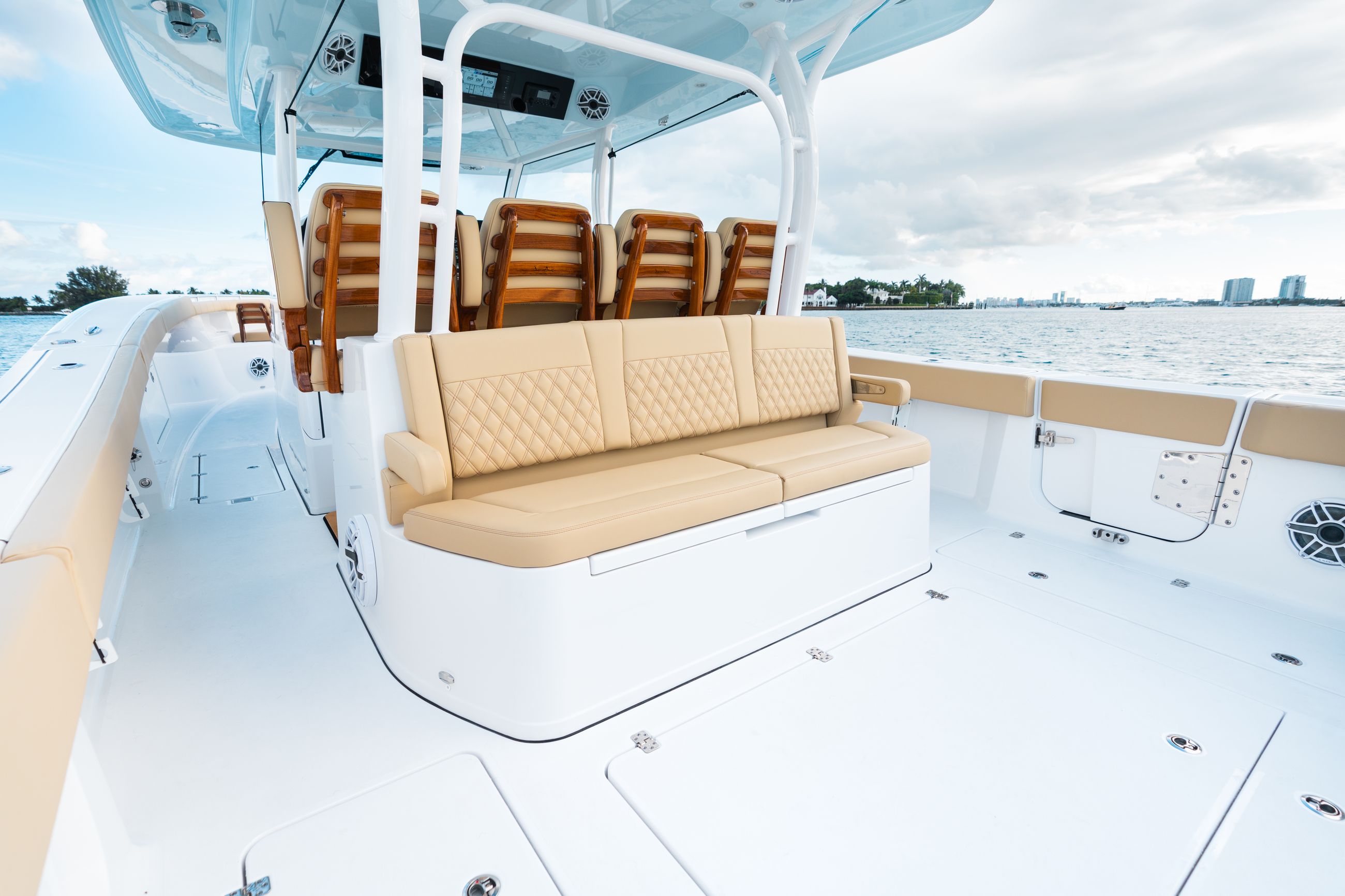 The helm area features quad captain’s chairs, delivering support and comfort for long runs offshore. When equipped with the Release Marine seating package, these chairs can be heated or cooled, bringing true luxury seating into the center console world.