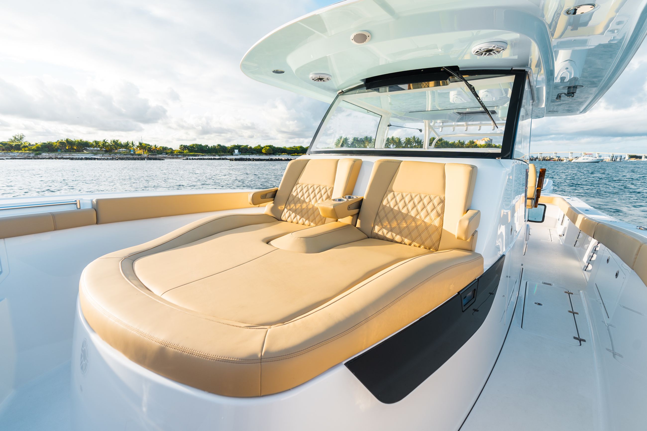 At the front of the console, an extremely large chaise lounge provides a premium forward facing seating option rarely seen on a fishing focused center console. This area becomes a favorite place to relax underway or at anchor while preserving full bow functionality.