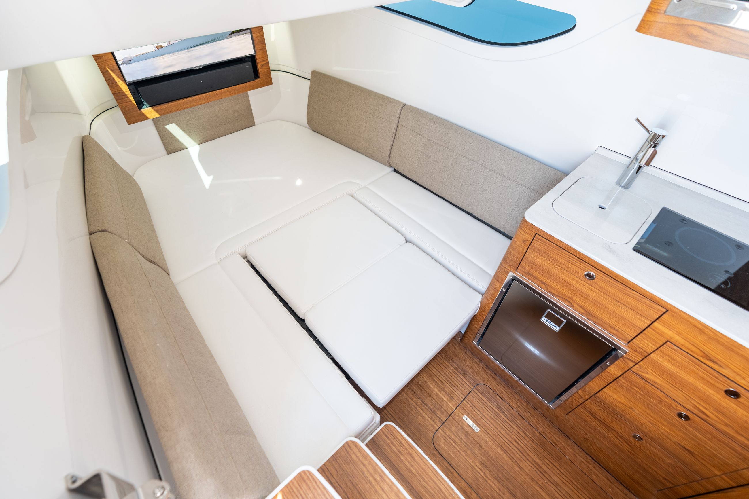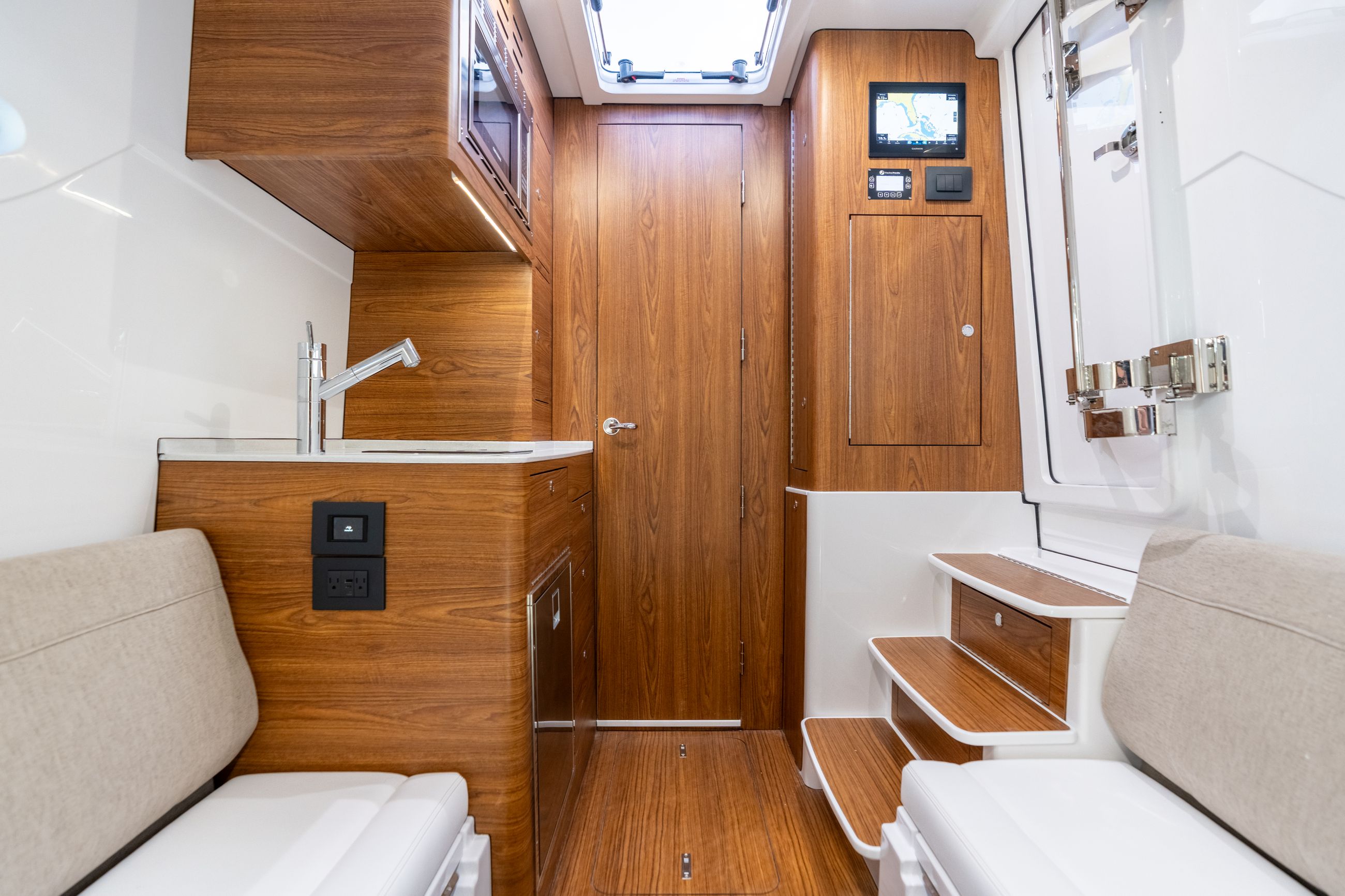 Below deck, the Open 402 offers a climate controlled cabin designed for overnight trips and extended stays. A convertible berth, enclosed head with shower and galley amenities create a functional living space that feels refined and practical. Powering these systems is an 8kW Fischer Panda generator, allowing owners to run air conditioning, electronics and onboard comforts while away from the dock.