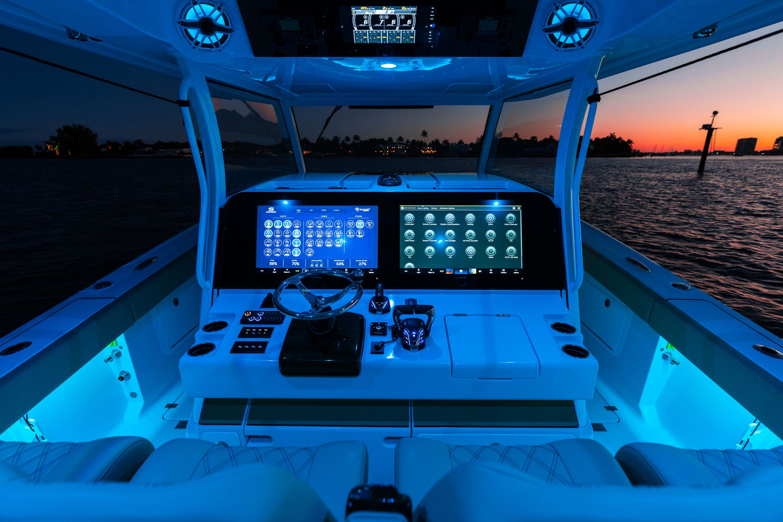 From this centralized control system, operators can manage lights, pumps and accessories while also monitoring battery voltage, fuel level, freshwater level, time and speed in real time. Everything is presented clearly in one place, making operation intuitive from the first day of ownership.