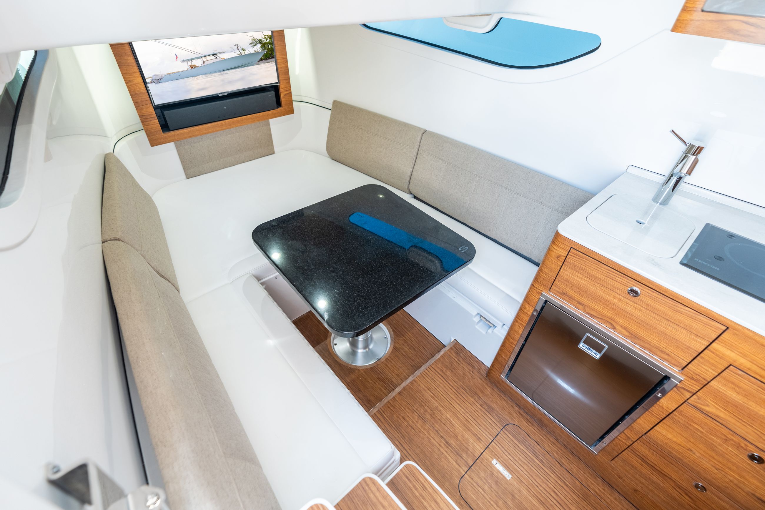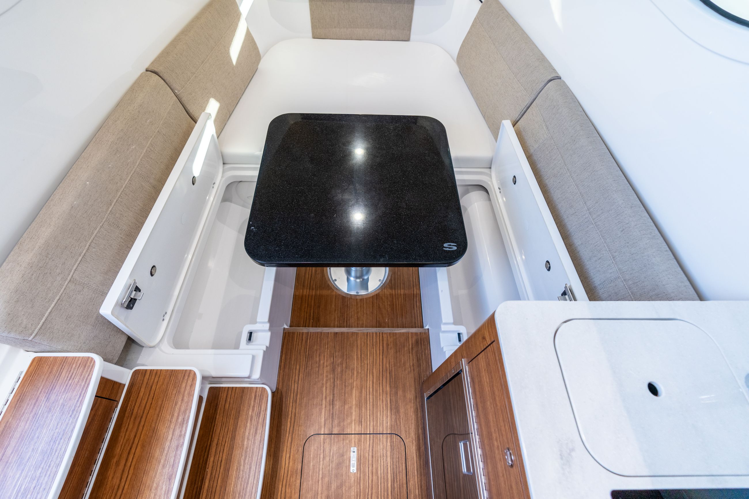 A day on the water usually starts with a plan. Maybe it’s a long offshore run. Maybe it’s a full family day that turns into an overnight. Either way, the cabin quickly becomes the center of the experience. During the day, the U shaped dinette gives everyone a place to sit, eat and get out of the sun. Kids sprawl out with snacks. Gear gets organized. It’s a calm place to regroup without stopping the day.