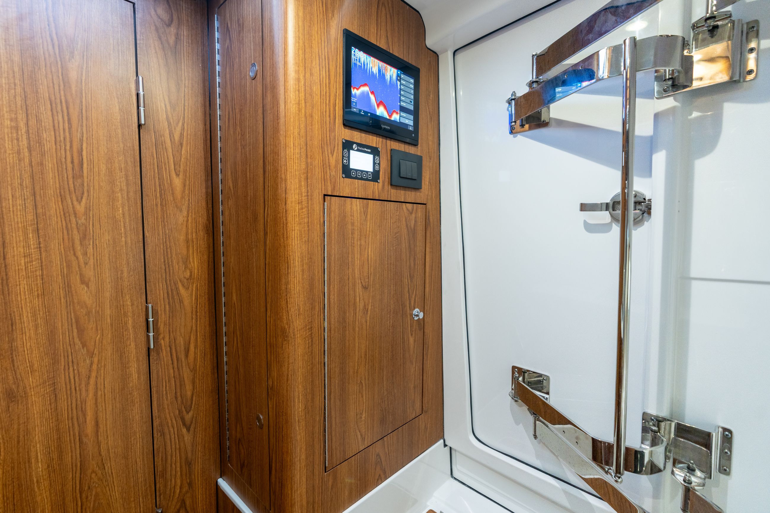 Even inside, the Open 402 never forgets what it is. Rods are stored safely in vertical holders built into the floor. Electronics access is clean and straightforward. Systems are monitored from a dedicated panel and even from a Garmin display down below. Nothing feels hidden or difficult to reach.
