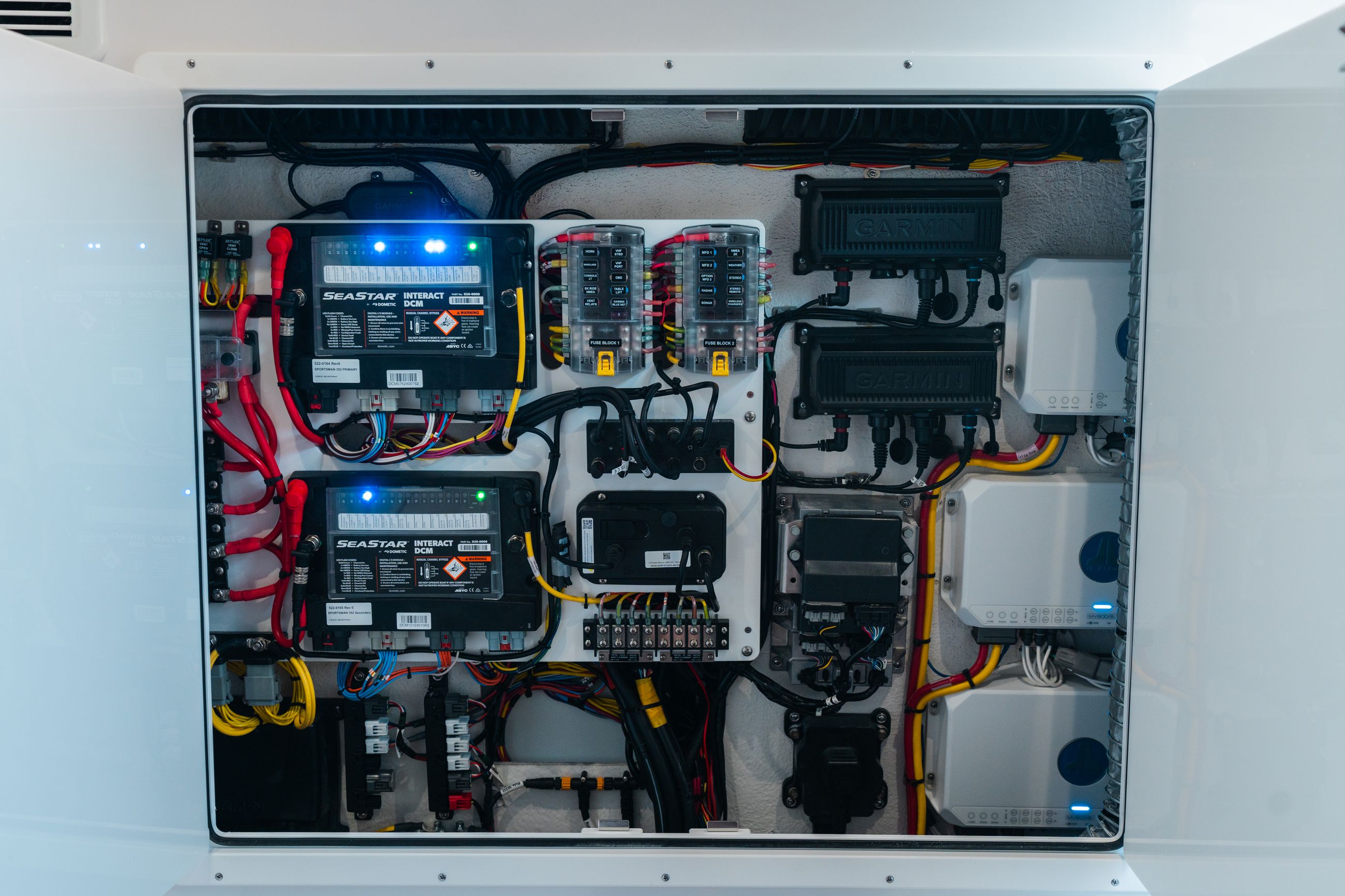 Behind the total access doors in the console, there’s a DCM switching panel. If your Garmin display ever goes down, you’re not stuck. You can manually move a fuse to constant power and run that system directly. No screens, no menus, no guesswork. It’s a simple, mechanical backup built into the boat from day one.